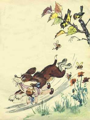 Очнулась она от громкого лая и увидела над собой добрую лохматую морду Шарика. Это он, верный ее товарищ, весь день, когда обнаружилась пропажа, не находил себе места и отправился на розыски.